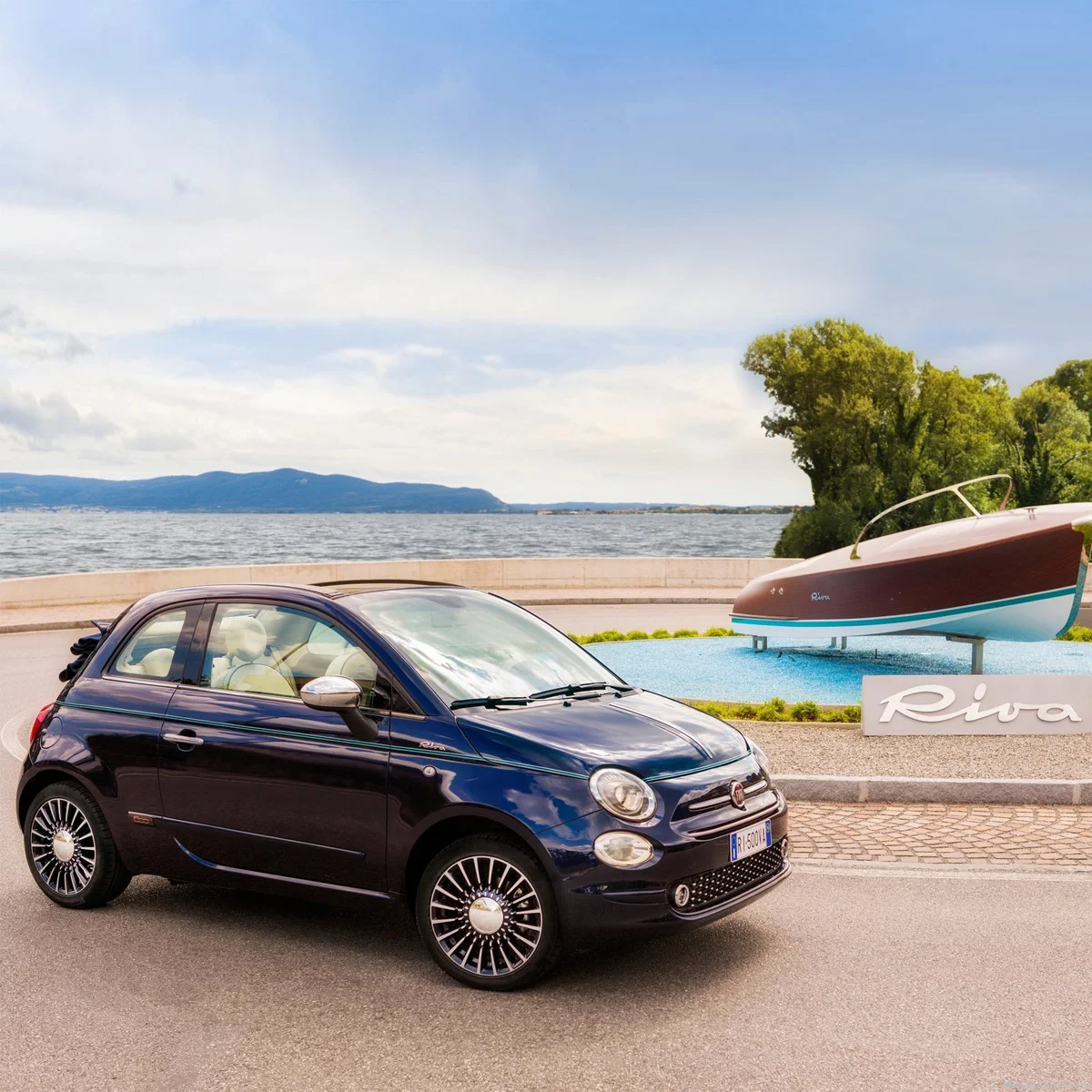 The Riva inspired 500 includes many design cues from the yachts; a unique paint used known as Sera blue, a double aquamarine line running around the middle of the car, and a hand painted mahogany dashboard. Chrome plating has been used to further enhance the visual link between the two; with the mirror caps, door handles and bonnet trim all getting a mirror-finish.